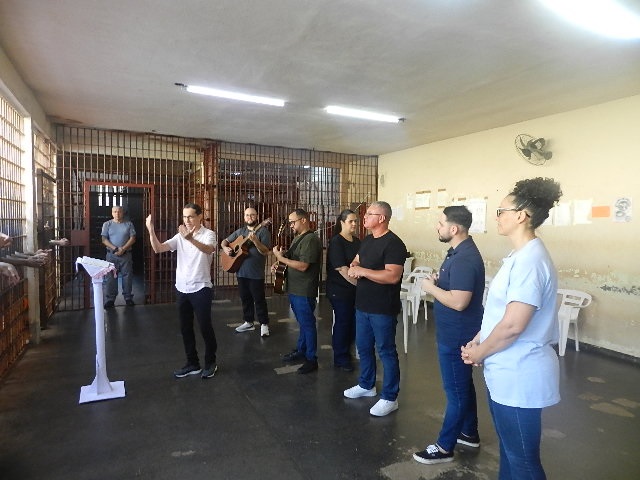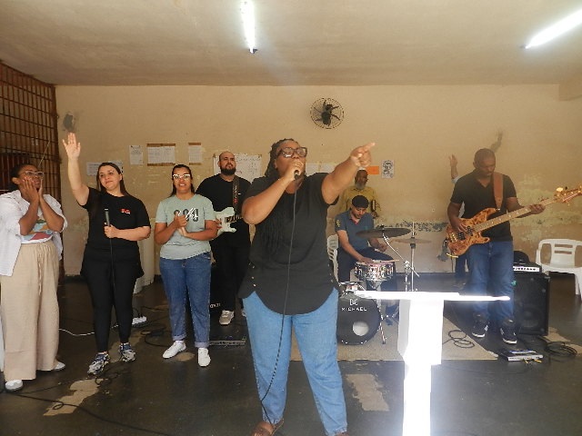 Na sequência, a Assembleia de Deus conduziu atividades de louvor com banda formada por guitarra, baixo, bateria e vocal. Os encontros mobilizaram a unidade e contaram com a participação de 200 internos.