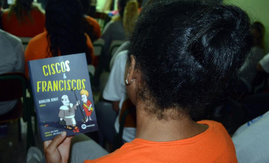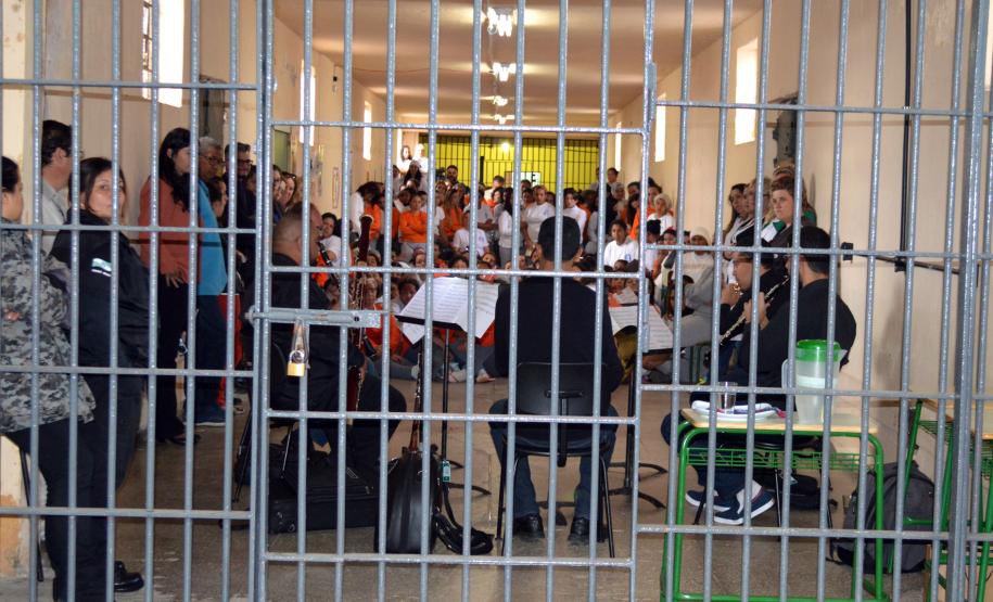MÚSICA - Além da atividade literária, na mesma tarde, o grupo Sopro5 realizou um breve concerto que animou a plateia na unidade prisional. Formado por solistas do naipe de madeiras da Orquestra Sinfônica do Paraná, os músicos Fabrício Ribeiro (flauta), João Vitor Silva (fagote), Marcelo Oliveira (clarinete), Marcos Vicenssuto (Oboé) e Fábio Jardim (trompa) fizeram questão de apresentar seus instrumentos, individualmente, além de contar um pouco da história e origem de cada um.