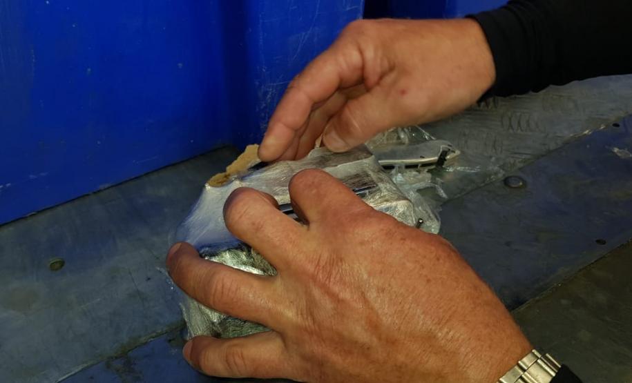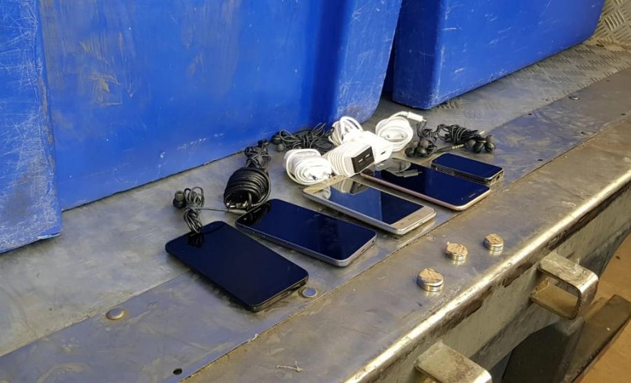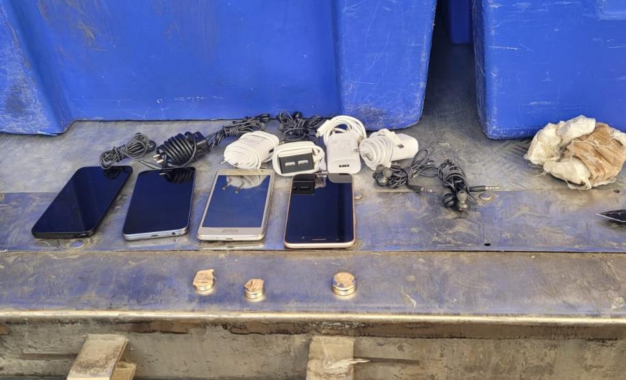 Agentes penitenciários apreenderam um invólucro com cinco celulares e carregadores que estavam escondidos embaixo da carroceria de um caminhão que transportava alimentação para os presos da Penitenciária Central do Estado – Unidade de Segurança (PCE-US), em Piraquara, na Região Metropolitana de Curitiba, durante o feriado.