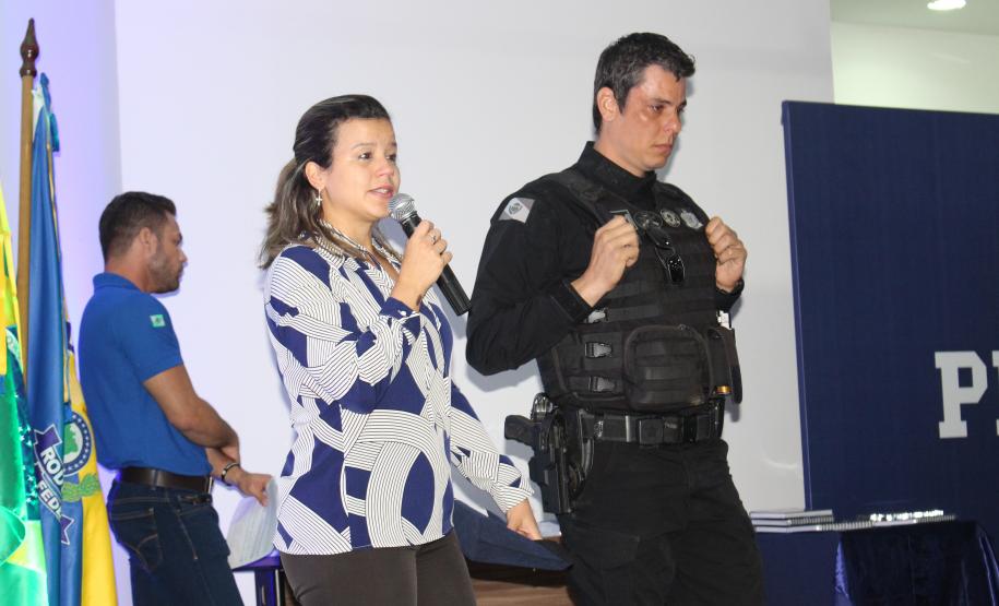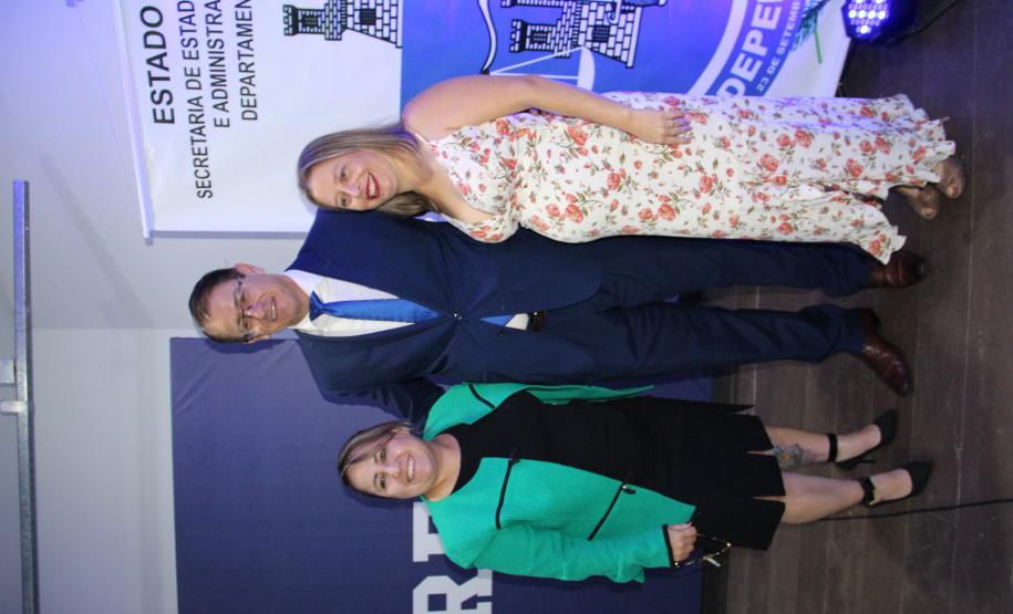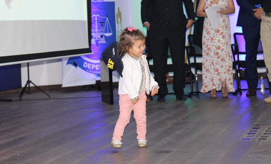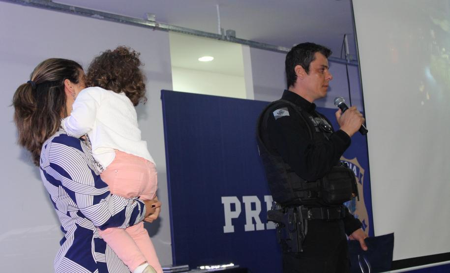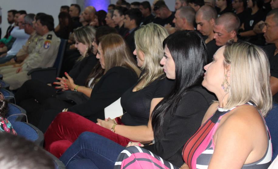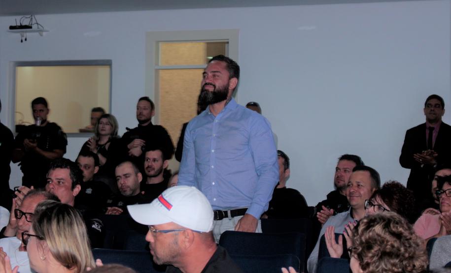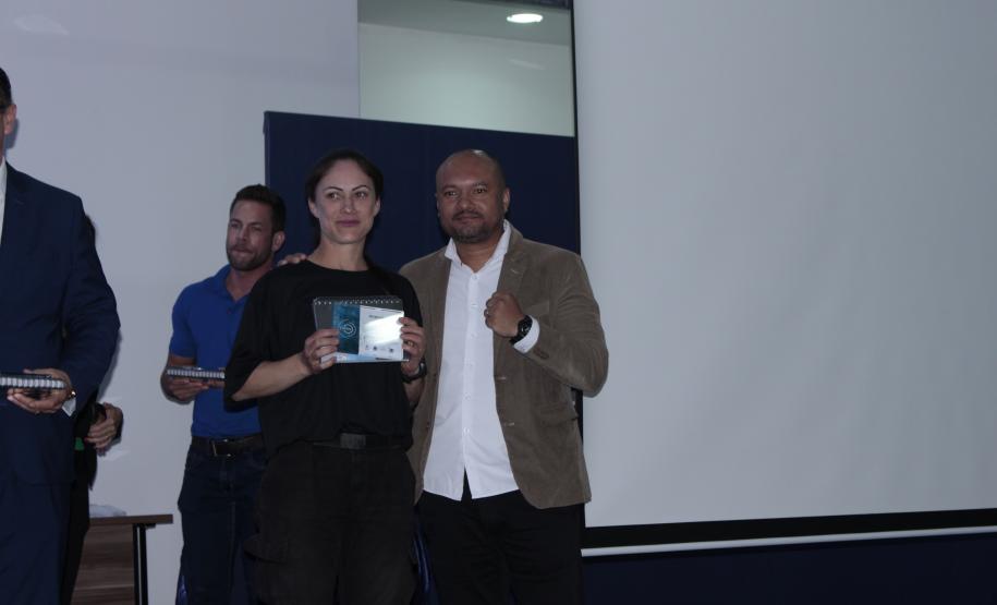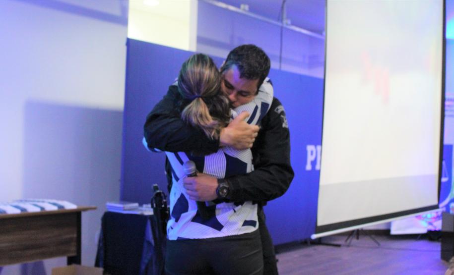 HOMENAGEM – Na solenidade, ainda foi homenageado o agente Thiago Borges Carvalho, membro do Setor de Operações Especiais de Londrina, que morreu durante uma emboscada, em dezembro de 2016, após fazer uma operação de revista de rotina na Penitenciária Estadual de Londrina II (PEL2). A esposa dele, Raíssa Carvalho recebeu uma lembrança das mãos do servidor Maurilio Avelar, que lamentou o ocorrido. “Tive a honra de ombrear com este guerreiro, que hore não está mais ao nosso lado, mas de quem levo todo o ensinamento”, afirmou. Raíssa levou o público às lágrimas ao lembrar do amor que o marido tinha pela profissão. “Essa era a paixão dele, ele era dedicado e realmente amava o que fazia”, afirmou.