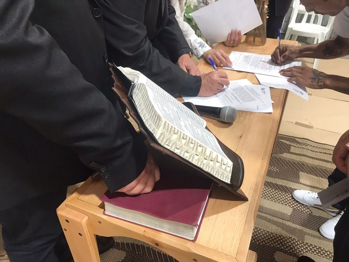 Entre os casais, estava um par homoafetivo — um dos noivos já em liberdade e o outro cumprindo pena na PEFB — e um casal formado por uma mulher custodiada na Cadeia Pública de Dois Vizinhos e um homem recluso na unidade.