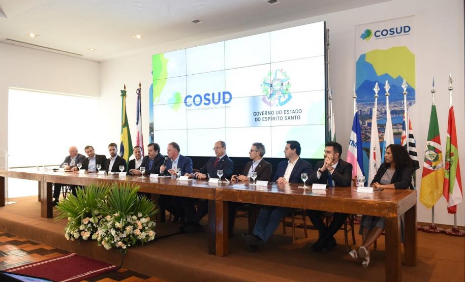 O Paraná participou na última semana do 4º Encontro do Consórcio de Integração Sul e Sudeste (Cosud), que neste ano teve o tema “Gás e Infraestrutura”. O evento ocorreu no Palácio Anchieta, em Vitória, no Espírito Santo, e contou com a presença do governador do Paraná, Carlos Massa Ratinho Junior, e representantes dos sete estados das duas regiões. Dentre os temas abordados estava segurança e administração penitenciária, e quem representou o Paraná neste grupo de trabalho foram o secretário da Segurança Pública, coronel Romulo Marinho Soares, e o vice-diretor do Departamento Penitenciário do Paraná, Thorstein Ferraz.