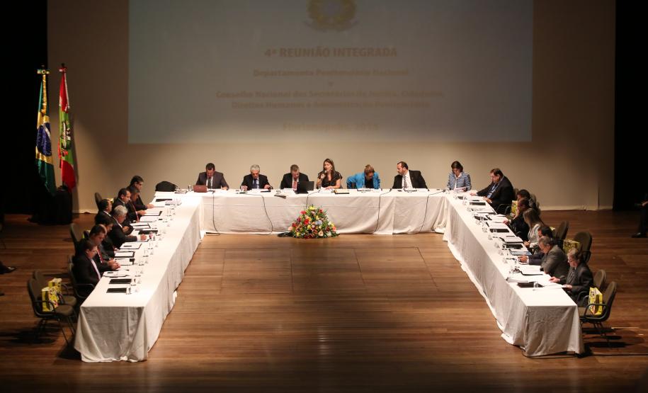 O diretor do Departamento de Execução Penal do Paraná (Depen), Luiz Alberto Cartaxo Moura, representando o secretário da Segurança Pública e Administração Penitenciária, Wagner Mesquita, participou nesta segunda-feira (14), da 4ª Reunião Integrada Ordinária do Conselho Nacional de Justiça, Direitos Humanos e Administração Penitenciária e Departamento Penitenciário Nacional, no Teatro Pedro Ivo, no Centro Administrativo do Governo do Estado de Santa Catarina, em Florianópolis.