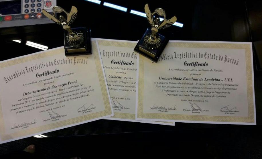 O Departamento Penitenciário do Paraná (Depen) recebeu mais um reconhecimento pelas atividades desenvolvidas. A instituição foi premiada com o terceiro lugar no Prêmio “Paz Paranaense”, Categoria Interinstitucional, com o projeto “Observatório de Infectologia do Sistema Penal”, coordenado pela Assessoria de Projetos do Depen e a Universidade Estadual do Oeste do Paraná, que promoveu vários mutirões de saúde nas unidades de regime fechado masculinas do Paraná. A proposta teve como finalidade mostrar que é possível prevenir doenças contagiosas a partir da promoção de testes.