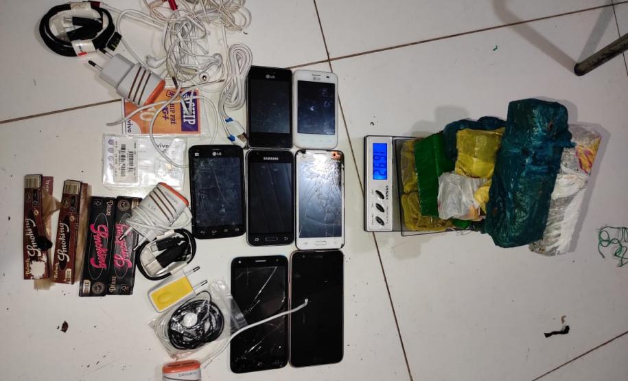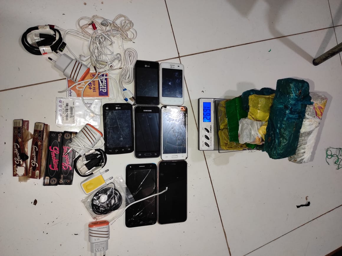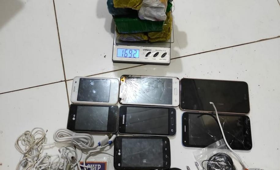 Foram apreendidos três invólucros que continham 1692 gramas de substância análoga a maconha, sete aparelhos celulares e carregadores.
