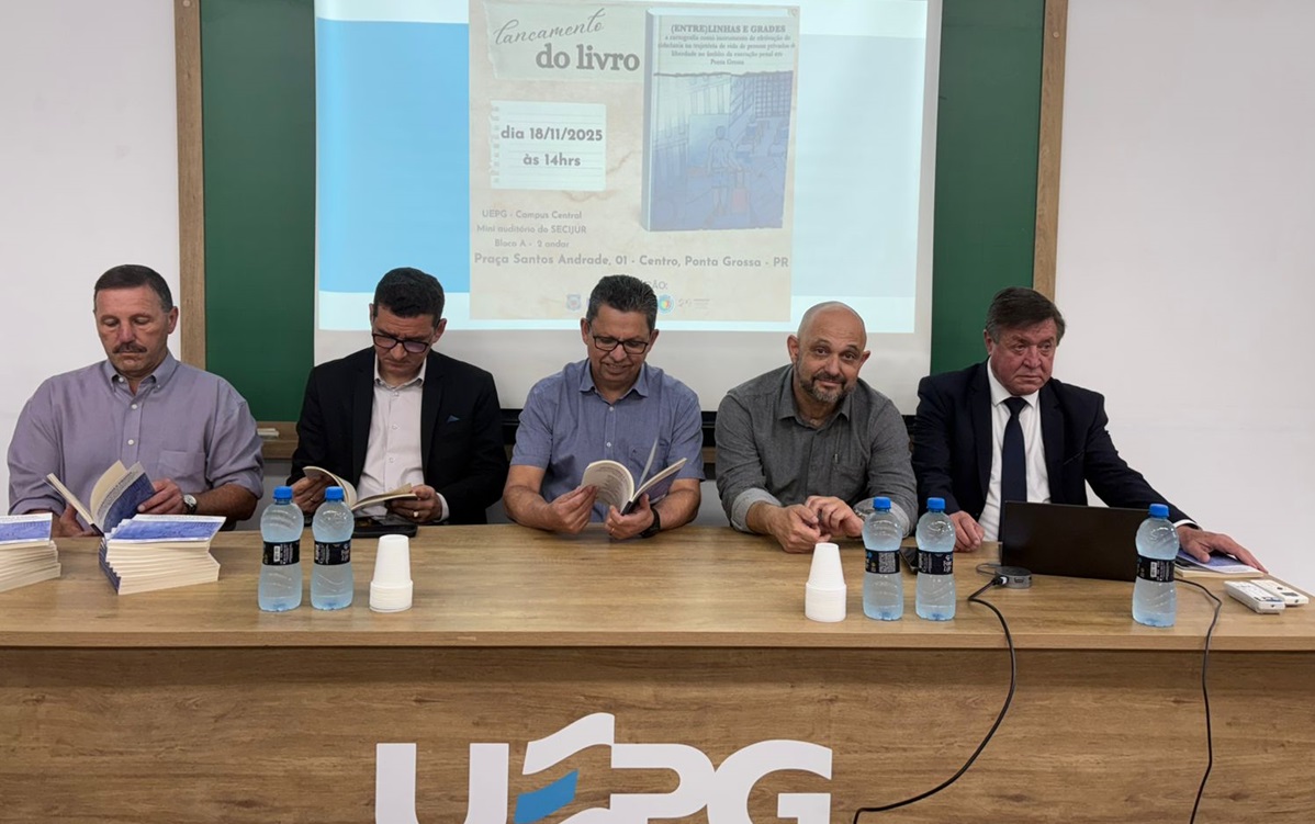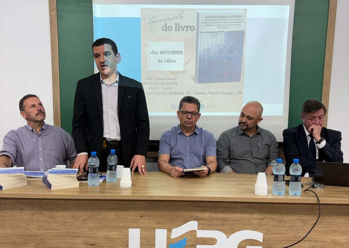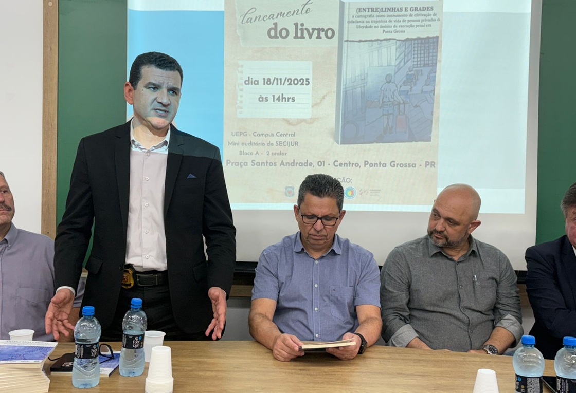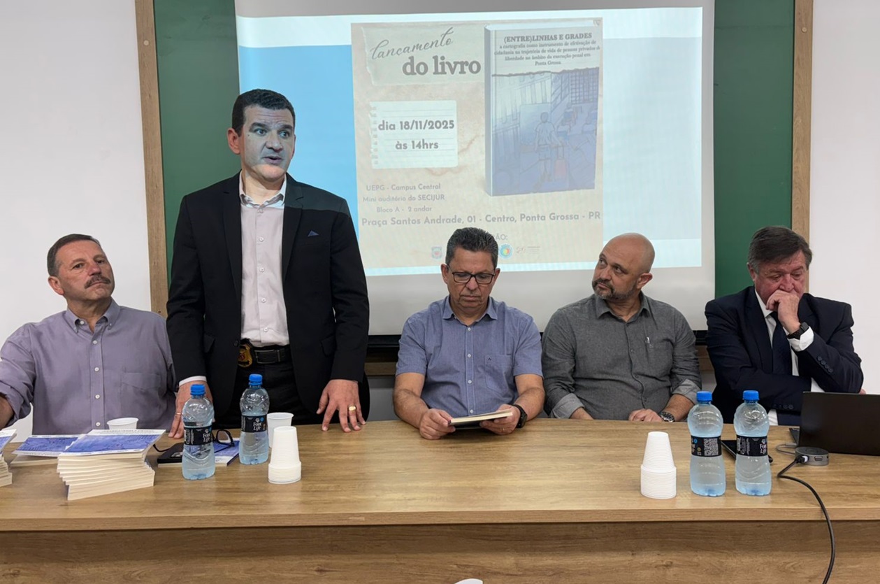 A Polícia Penal do Paraná (PPPR), por meio do Complexo Social de Ponta Grossa, realizou o lançamento do livro “(Entre)linhas e grades: a cartografia como instrumento de efetivação de cidadania na trajetória da vida de pessoas privadas de liberdade no âmbito da execução penal em Ponta Grossa”. A publicação é resultado de uma ampla articulação entre a PPPR, o Projeto de Extensão do Núcleo de Atendimento às Pessoas em Monitoração Eletrônica (Nupem), a Universidade Estadual de Ponta Grossa (UEPG) e o Conselho da Comunidade de Ponta Grossa.