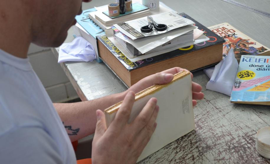 RESTAURAÇÃO - Os livros, segundo o vice-diretor da unidade, chegam ao Hospital com os mais diversas problemas e, muitas vezes, precisam, inclusive, de uma nova capa. “Quando não é possível a recuperação da capa original, o livro ganha uma nova, desenhada pelos presos do canteiro, que, para fazer a ilustração, precisam ler o conteúdo e conhecer a história, o que estende o acesso à cultura”, afirma.