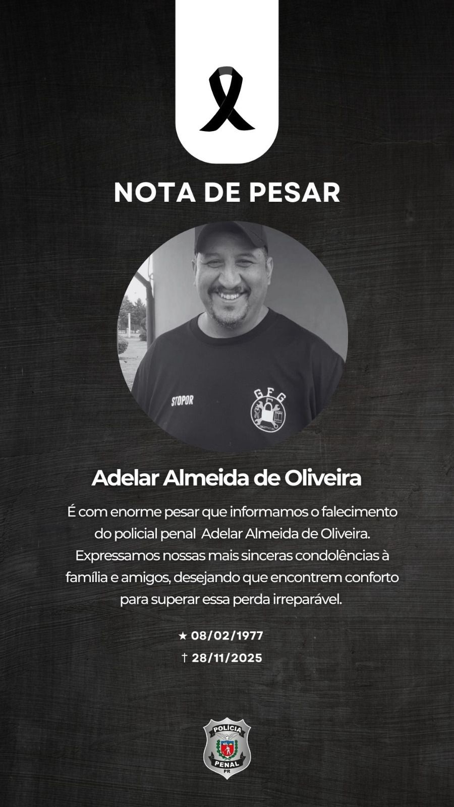 É com profundo pesar que a Polícia Penal do Paraná comunica o falecimento de Adelar Almeida de Oliveira, servidor do sistema penal desde abril de 2008 e residente em Guarapuava.