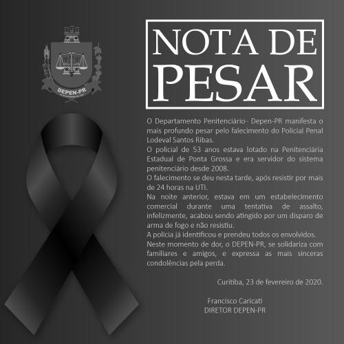 O Departamento Penitenciário do Paraná lamenta a perda do policial penal Lodeval Santos Ribas, falecido neste domingo, 23/02. Neste momento de dor, nos solidarizamos com seus familiares e amigos pela grande perda e registramos nosso agradecimento à dedicação e contribuição prestada a este Departamento.
