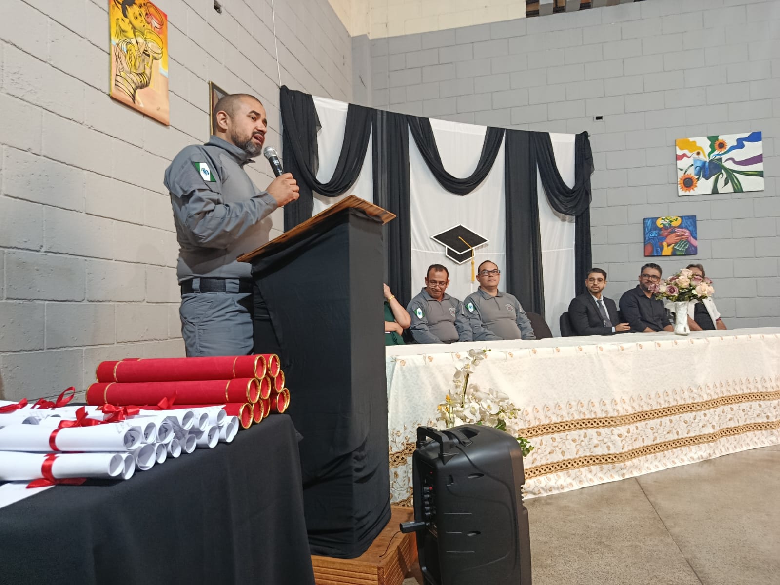 Na manhã desta terça-feira (9), a Polícia Penal do Paraná (PPPR), em parceria com o Centro Estadual de Educação Básica de Jovens e Adultos (Ceebja) Helena Kolody, realizou uma cerimônia de formatura para pessoas privadas de liberdade (PPL) que concluíram etapas do Ensino Fundamental e Médio na modalidade Educação de Jovens e Adultos (EJA), na Penitenciária Estadual de Foz do Iguaçu II (PEF II). Foram certificados 37 internos, sendo 16 no ensino fundamental fase I, 13 no ensino fundamental fase II e 8 no ensino médio.