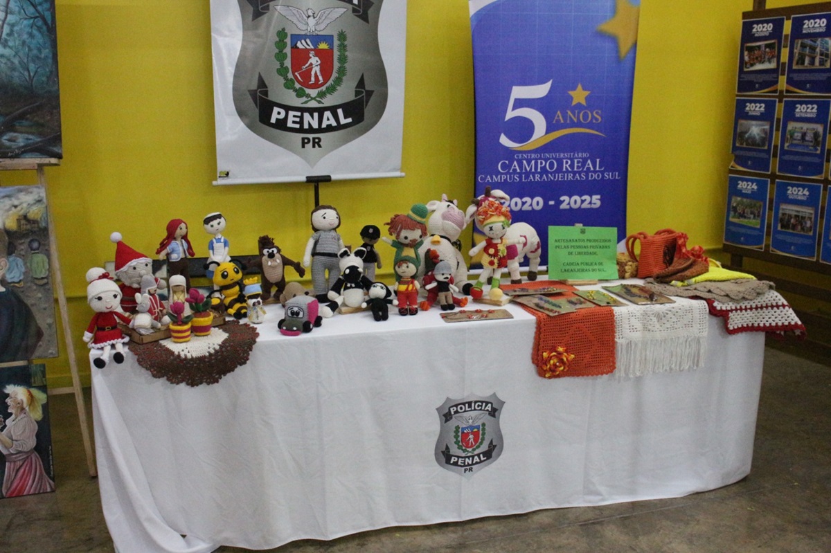 A Polícia Penal do Paraná (PPPR) está participando da Semana Cultural do Centro Universitário Campo Real, em Laranjeiras do Sul, entre os dias 27 e 31 de outubro, com uma exposição especial de telas e artesanatos produzidos por pessoas privadas de liberdade da Cadeia Pública de Laranjeiras do Sul, a convite da instituição de ensino.