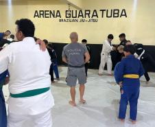 Durante ações da operação Verão Maior Paraná, a Polícia Penal do Paraná (PPPR) realizou uma ação social com crianças e adolescentes carentes que praticam jiu-jitsu e muay thai dentro do projeto social “Construindo Campeões”, desenvolvido na cidade de Guaratuba, no litoral do estado. Durante o evento, os alunos do projeto puderam ter uma aula diferente, aprendendo técnicas de arte marcial com um policial penal lotado na regional administrativa de Ponta Grossa e que também é instrutor de jiu-jitsu, além de interagir com os cães da unidade K9 e conhecer drones utilizados nas operações da PPPR. Também foi realizada uma distribuição de brindes e uma confraternização com um lanche especial.