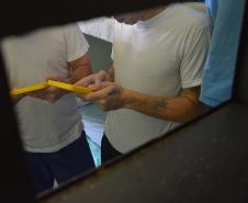 EXPECTATIVA – Para o preso R.M.B., de 29 anos, na Peco há um ano e quatro meses, o novo recurso será um reforço nos estudos. “Vai ser muito interessante porque na sala de aula aprendemos com a explicação da professora, uma explicação boa. Mas quando chegamos na cela, muitas vezes esquecemos o que a professora explicou. Com o tablet, vamos poder rever todo o conteúdo que ela passou para a gente”, acredita. Já o detento A.C., 34 anos, há quatro anos na Peco, diz que a iniciativa irá aproximá-lo da realidade fora da unidade prisional. “Estou ansioso, porque os tablets podem ajudar muito a gente aqui dentro e também lá fora perante a sociedade. Isso vale muito para a gente. Mesmo aqui ficamos próximo da tecnologia”, diz.