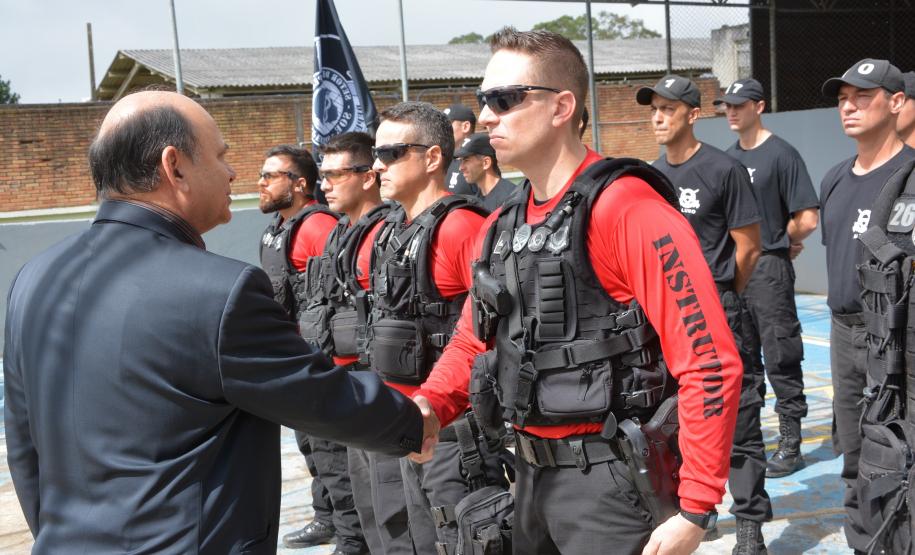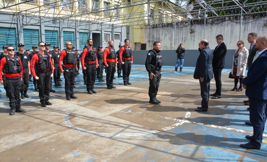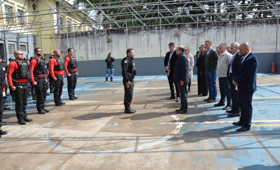 PROJETOS – A comitiva visitou um projeto de mecanização de abertura das portas que está sendo instalado na Penitenciária Estadual de Piraquara. A iniciativa irá permitir que os agentes penitenciários movimentem os presos com mais segurança, sem a necessidade de contato direto. Também conheceu a base do Serviço de Operações Especiais (SOE), grupo de elite do sistema prisional que atua em situações de crise, e acompanhou o sexto curso de formação do grupo.