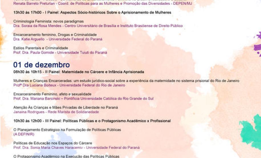 A responsável pelo setor de assessoria de projetos do Departamento Penitenciário do Paraná (Depen), Renata Torres, explica que um evento como esse é fruto do trabalho de um grupo formado no sistema penitenciário do Paraná. “Esse seminário tem um enfoque voltado, especialmente, à temática do encarceramento feminino, com a finalidade de dar espaço para novas propostas, sejam acadêmicas ou já profissionais na área”, afirma ela.